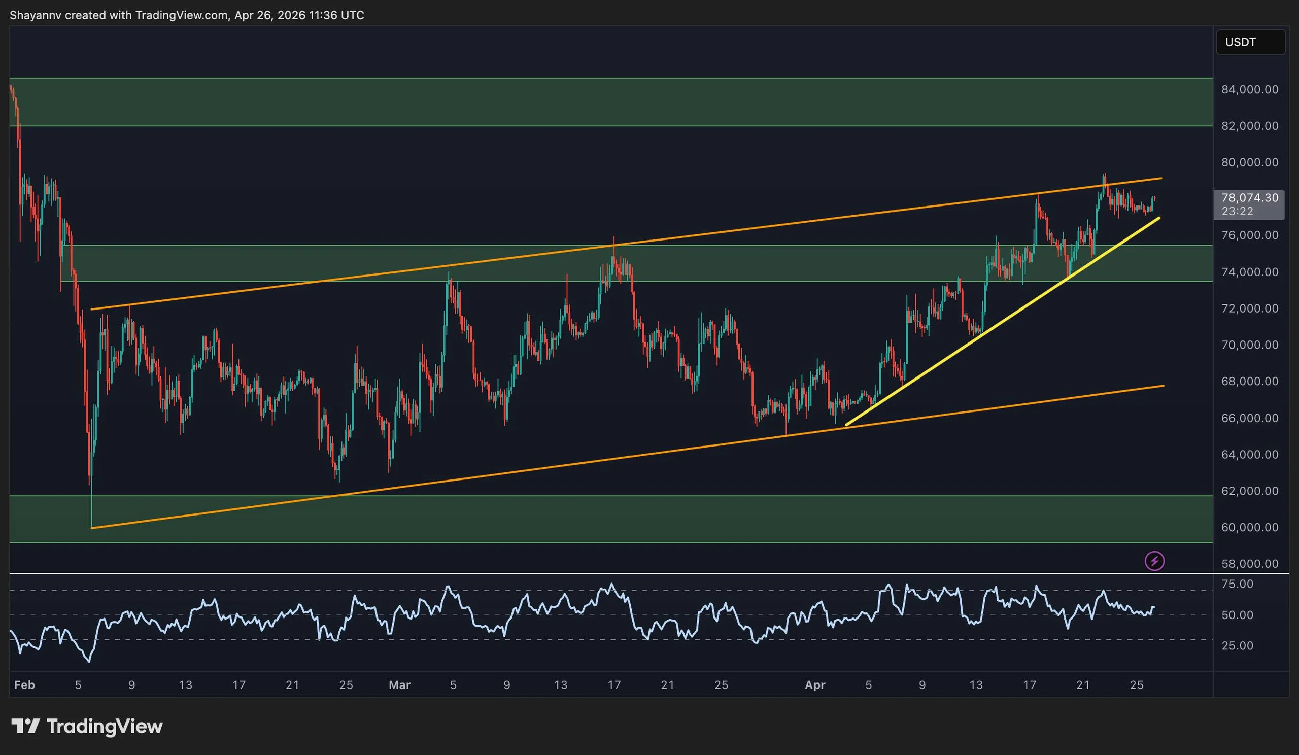 4 valandų grafike susiformavo įdomi dviejų lygių struktūra. Platesnis kylantis kanalas nuo vasario mėnesio žemumų įrėmina bendrą atsigavimą, o statesnė trumpalaikė trendo linija, atsiradusi balandžio pradžioje, veikė kaip tikrasis pastarojo postūmio variklis, per tris savaites pakeldama kainą nuo maždaug 68 000 USD iki dabartinių lygių prie 78 000 USD.